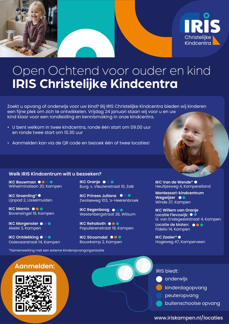 Zoekt u opvang of onderwijs voor uw kind? Bij IRIS Christelijke Kindcentra bieden wij kinderen een fijne plek om zich te ontwikkelen. Vrijdag 24 januari staan wij voor u en uw kind klaar voor een rondleiding en kennismaking in onze kindcentra. U bent welkom in twee kindcentra, ronde één start om 09.00 uur en ronde twee start om 10.30 uur. Aanmelden kan via https://forms.office.com/e/9zSFgVRe4v of via de QR code en bezoek één of twee locaties!